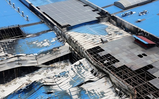 為什們會這么快就坍塌呢?我們做個簡單分析:事發現場滿目瘡痍,猶如世界末日,從現場我們可以看出,該建筑是由鋼結構為主體加上彩鋼夾芯板作為圍護建成的一座鋼結構商城,是一個典型的鋼結構建筑。鋼結構做為一種綠色建筑的代表,不耐火是它的劣勢,也是致命傷,從此次事故現場我們能看到,由于鋼結構柱子受熱已經變形扭曲剛度逐漸下降,慢慢失去了承重的能力,因而造成了商場建筑的坍塌。我們還可以看到該建筑的屋頂采用的是巖棉夾芯板,而巖棉的防火性能比較好,基本不燃,所以,主要的火源是商場的貨物。大火炙烤著底部的鋼結構柱子,當溫度越高,鋼構件的強度就越弱,以至于承受不起屋頂的重壓而造成了垮塌。
